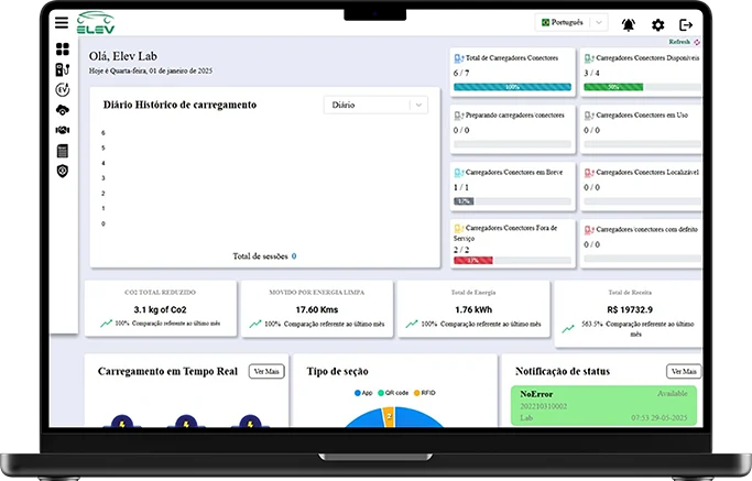 Acesse um dashboard multifuncional completo e inteligente para monitoramento, controle e faturamento do seu carregador com menus intuitivos e ferramentas avançadas para garantir uma gestão completa e personalizada dos seus carregadores com sincronização e análise de dados em tempo real em um único ambiente integrado, com recursos avançados e uma interface intuitiva que transforma dados em decisões estratégicas.